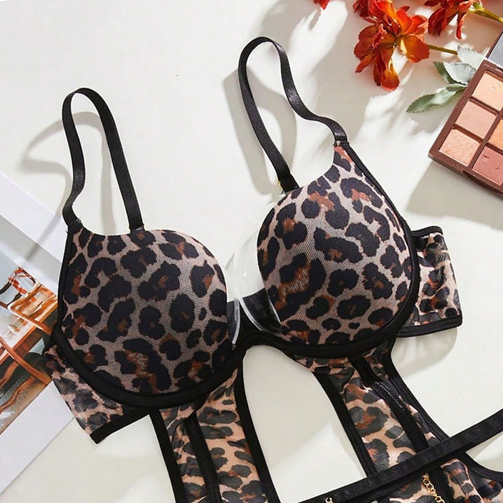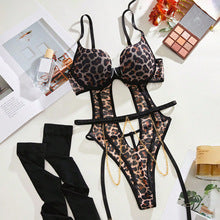Sexy Leopard Print Jumpsuit Erotic Lingerie Set with Metal Chain Anklets and Stockings for Role Play - Leopard print / S